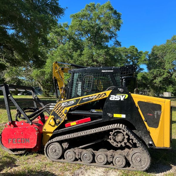 ASV RT-75 with Fecon mulcher. This machine is utilized to mulch overgrowth with trees up to 5" in diameter and smaller. The Fecon mulcher has knife teeth which produce a better end product when mulching. Ideal for clearing brush, trees, and stumps down to ground level.